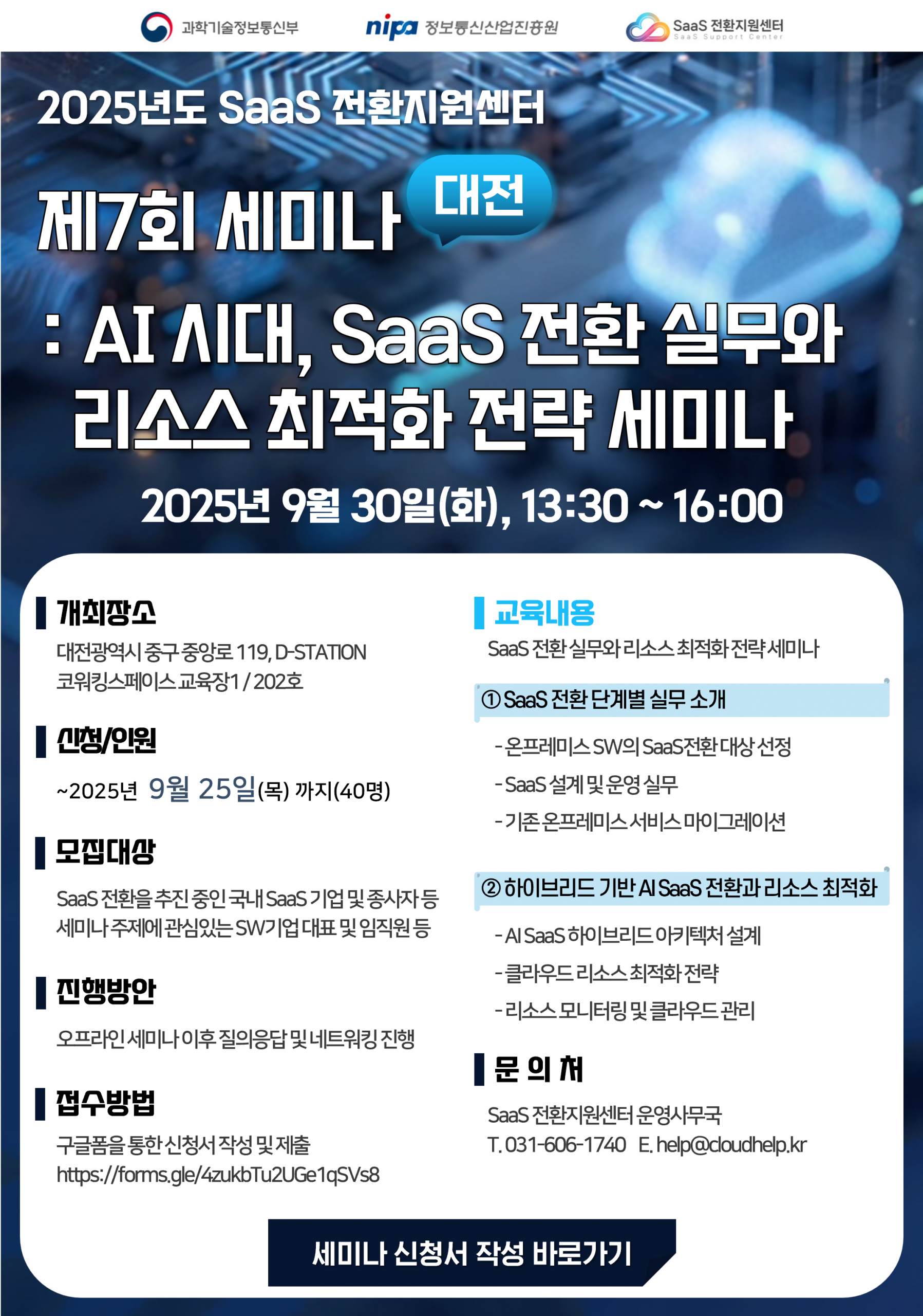 제목 [공고] 2025년도 제7회 세미나 : AI 시대, SaaS 전환 실무와 리소스 최적화 전략 세미나 참가자 모집공고(~9.25)