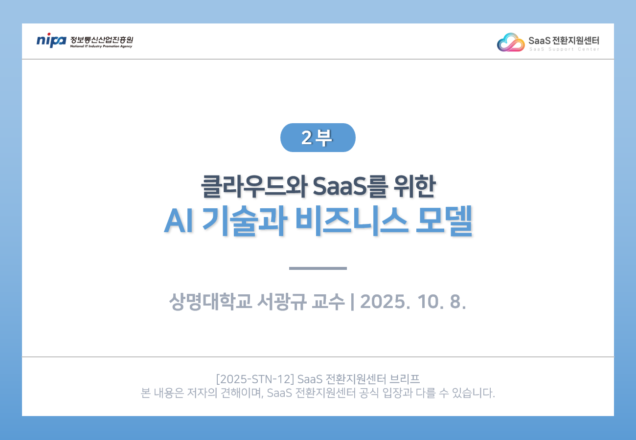 SaaS 전환지원센터의 저작물인 『클라우드와 SaaS를 위한 AI 기술과 비즈니스 모델』은 SaaS 전환지원센터에서 상명대학교 서광규 교수에게 집필 자문을 받아 발행한 전문정보 브리프로, SaaS 전환지원센터의 저작권정책에 따라 이용할 수 있습니다. 다만 사진, 이미지, 인용자료 등 제3자에게 저작권이 있는 경우 원저작권자가 정한 바에 따릅니다.